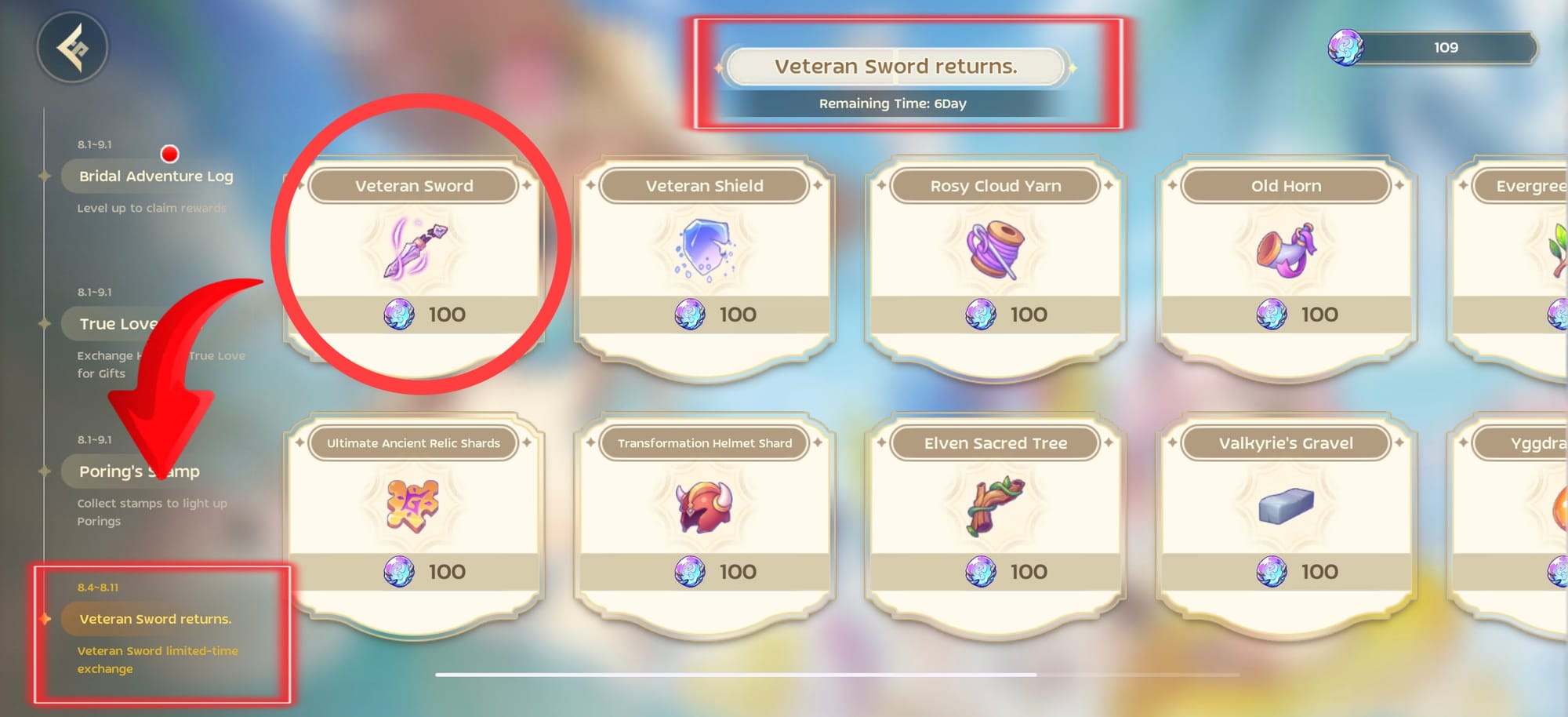 - ในช่วงระยะเวลาการขายกล่องของขวัญ ทางเข้า "กิจกรรมใหม่ - คำสัญญาแห่งงานแต่งงาน" จะนำดาบเวเทอรันกลับมาเพื่อแลกเปลี่ยนในเวลาจำกัด