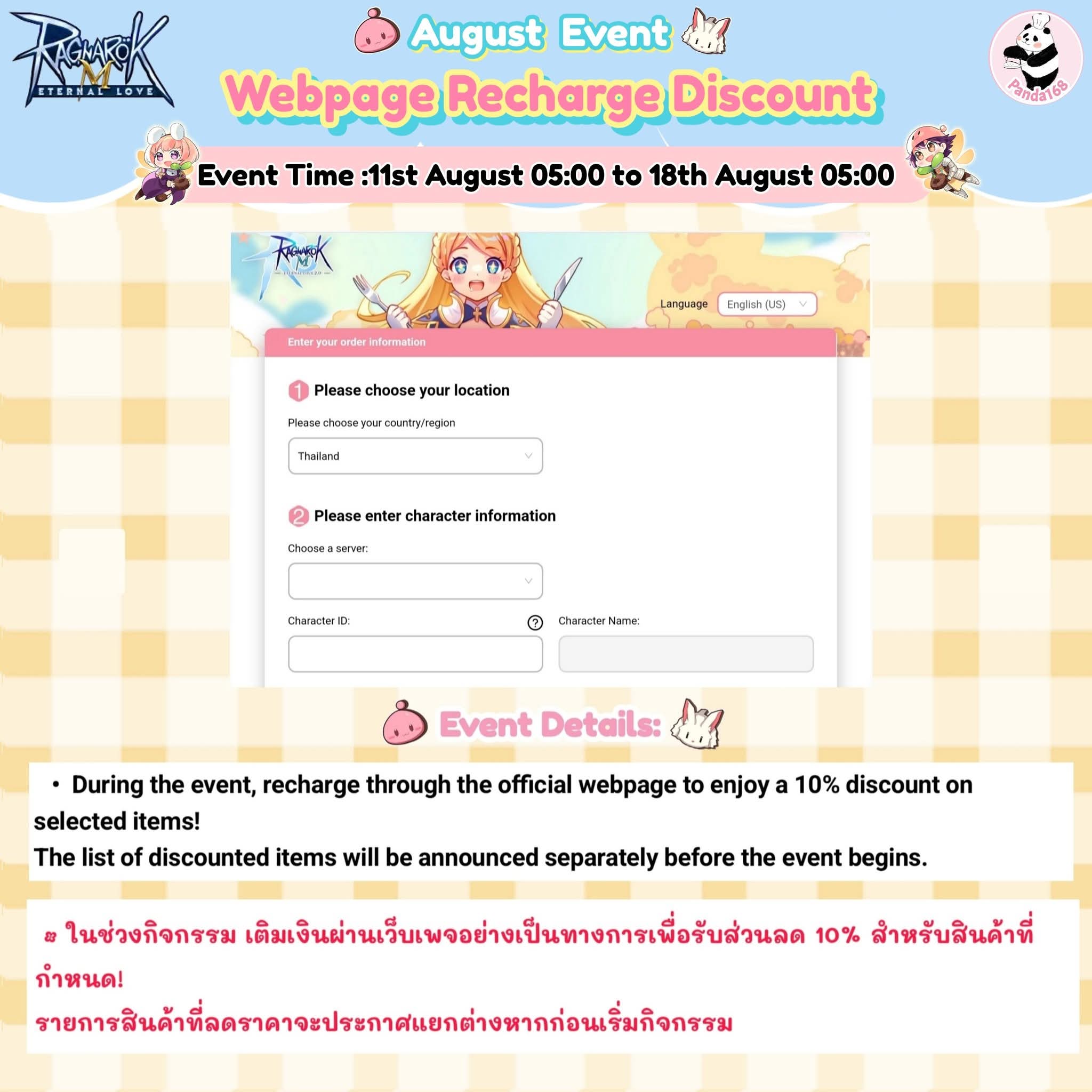 - ในช่วงกิจกรรม สินค้าบางรายการจะลดราคา 10% เมื่อเติมเงินผ่านช่องทางที่กำหนด รายละเอียดเพิ่มเติม โปรดดูประกาศในภายหลัง (หมายเหตุ: รายละเอียดกิจกรรมทั้งหมดขึ้นอยู่กับเนื้อหาภายในเกม)