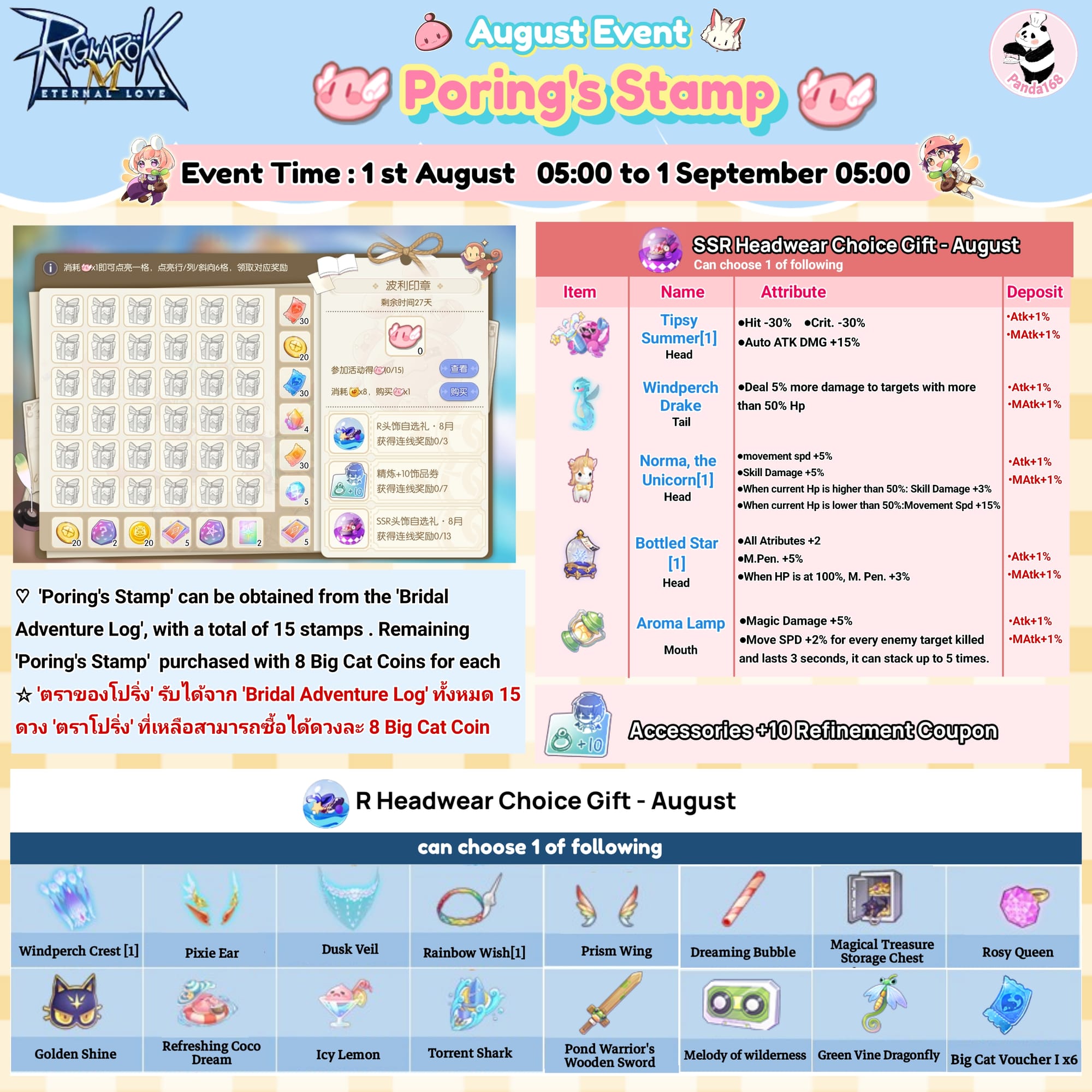 - A total of 15 "Poring's Stamp" can be obtained through the "Bridal Adventure Log." Additional "Poring's Stamp" can be purchased using Big Cat Coins.