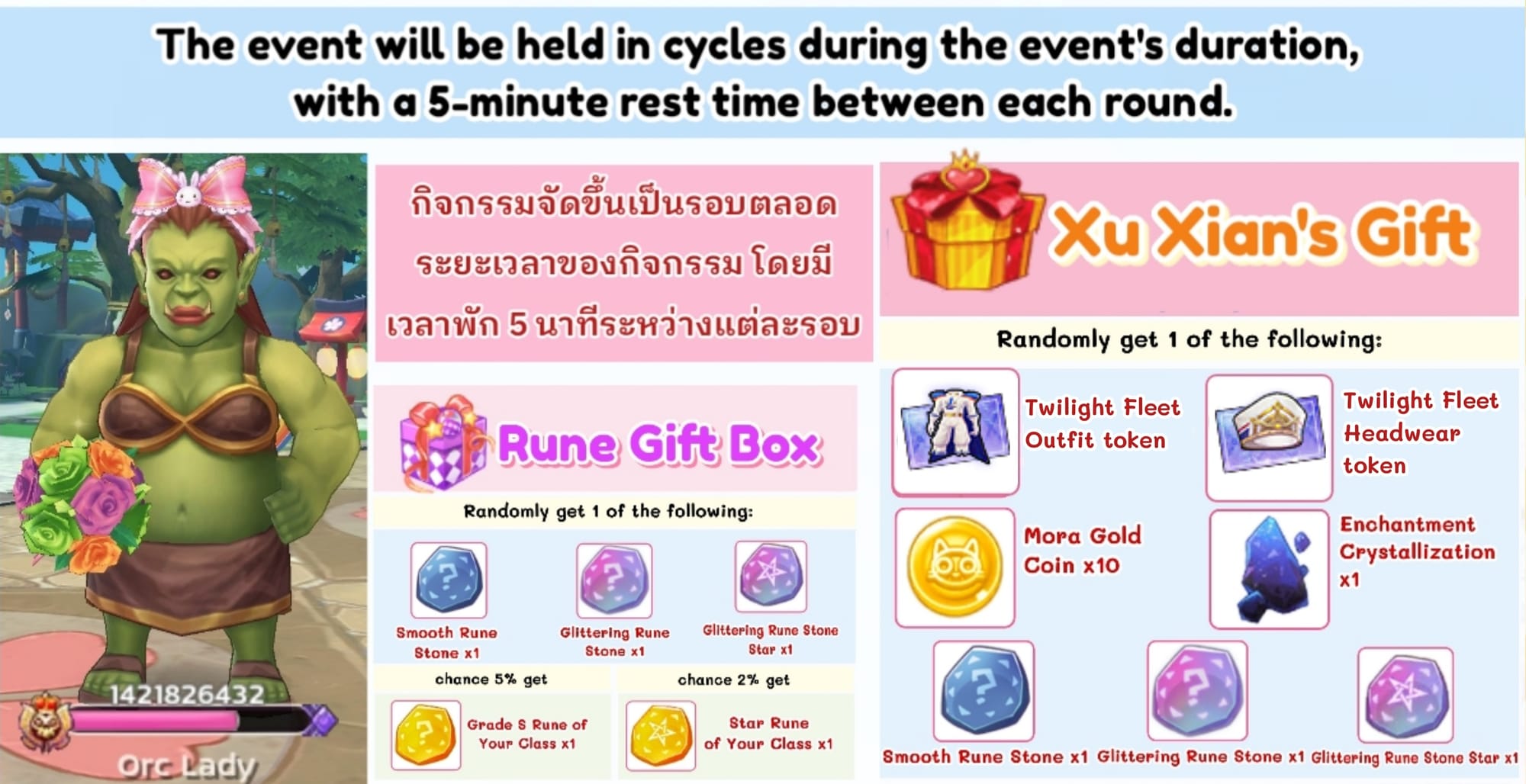 In the final stage of each event, "Orc Lady" will appear. Every time "Orc Lady" loses 10% HP, she will drop a circle of "Rune Gift Boxes" around her location. Defeating "Orc Lady" will reward you with 1 "Xu Xian's Gift - MVP."