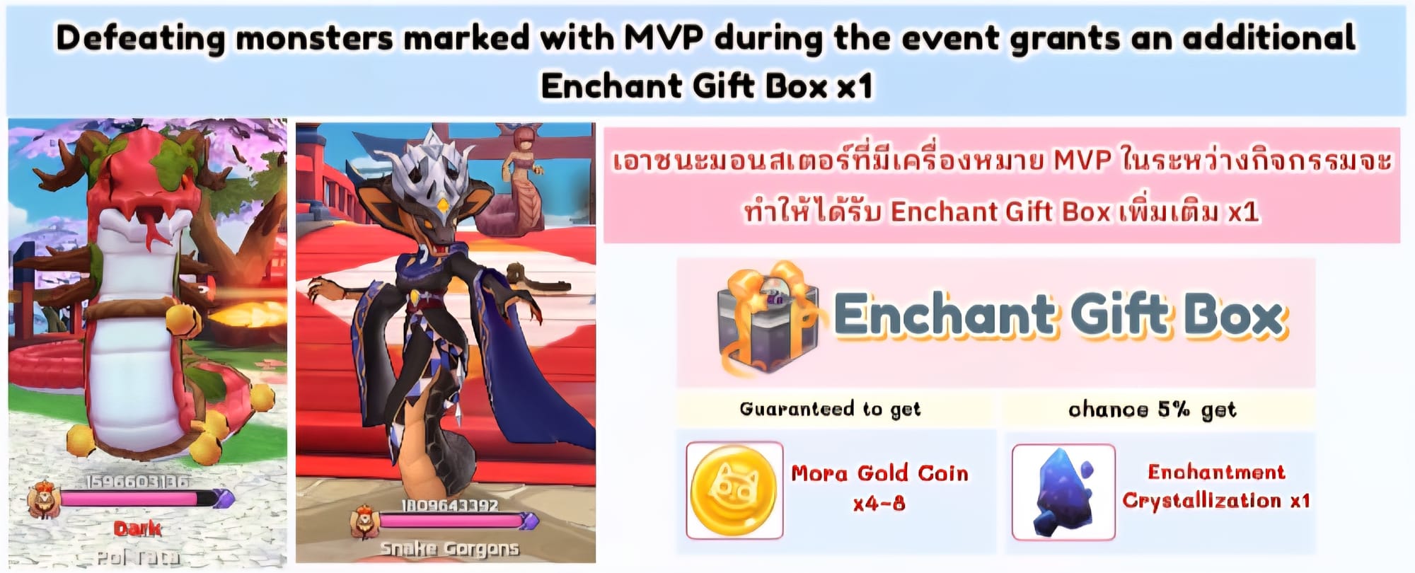 เอาชนะมอนสเตอร์ที่ถูกทำเครื่องหมายว่าเป็น MVP ในกิจกรรมจะทำให้คุณได้รับรางวัลเพิ่มเติมเป็น "Enchant Gift Box" จำนวน 1 กล่อง
