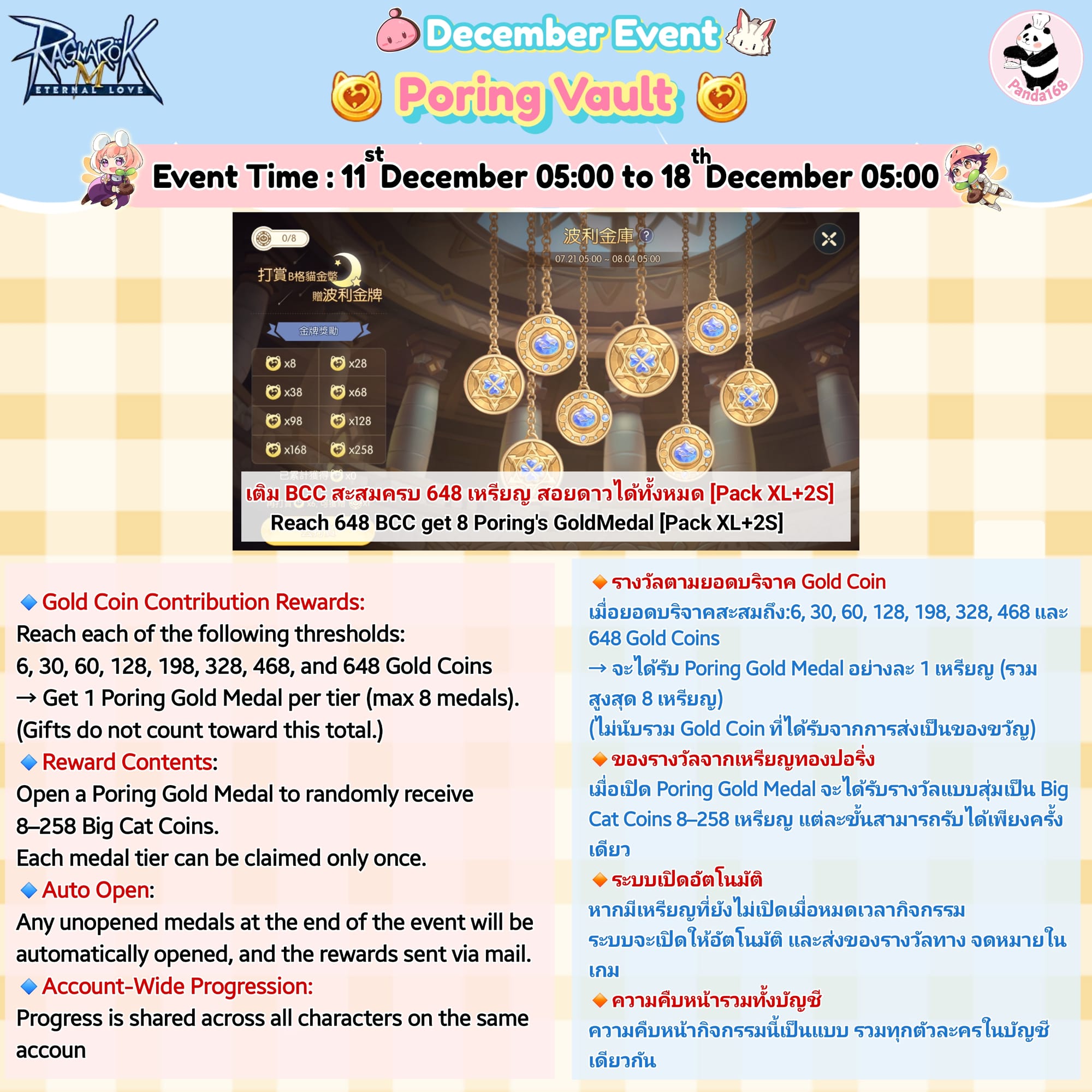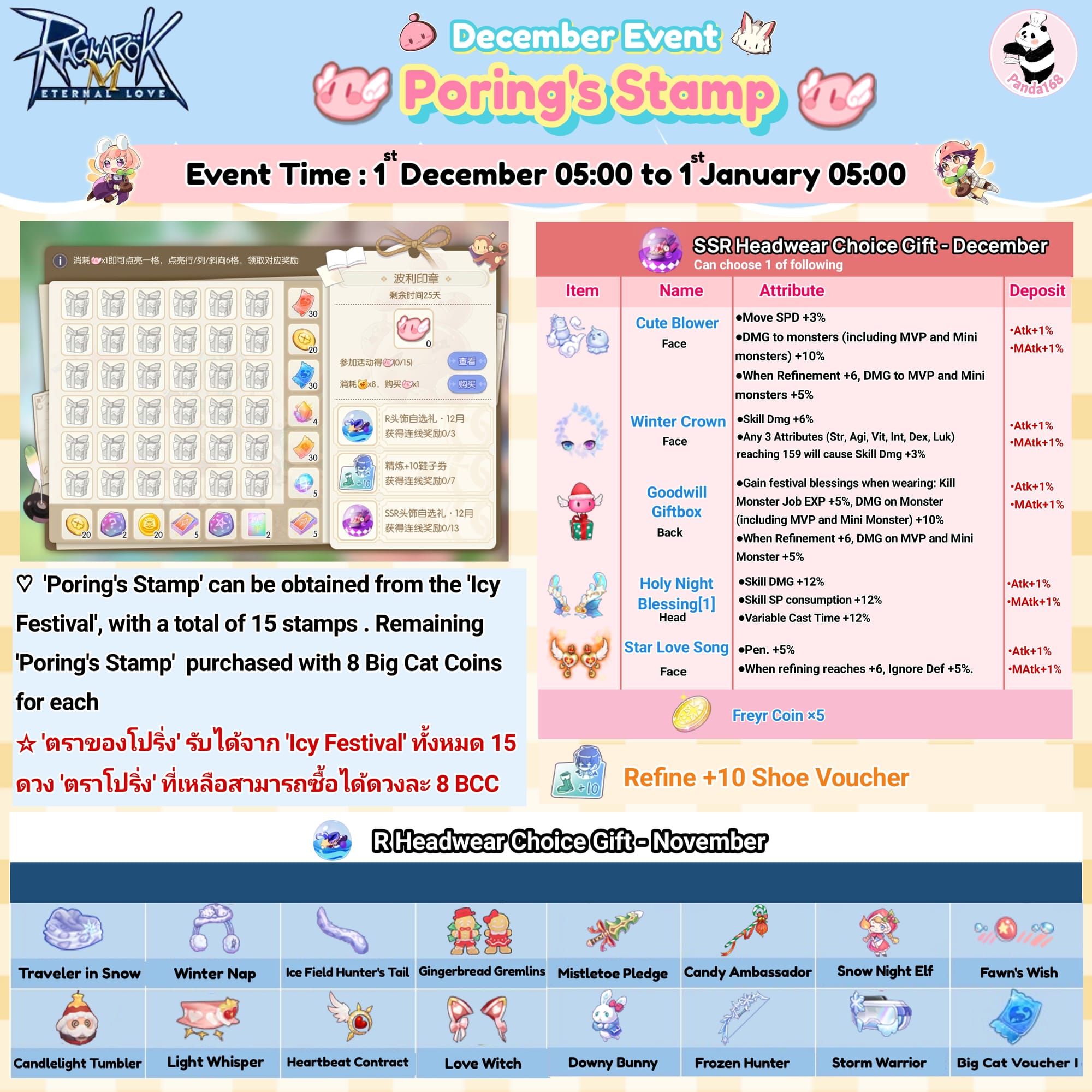 During the event, Adventurers with Base Level ≥ 25 can access "Poring's Stamp" via "New Event" - "Icy Festival". Spend "Poring's Stamp" to light up grids and receive generous rewards. A total of 15 "Poring's Stamp" can be obtained from "Icy Festival". The remaining stamps can be purchased using Big Cat Coins.
