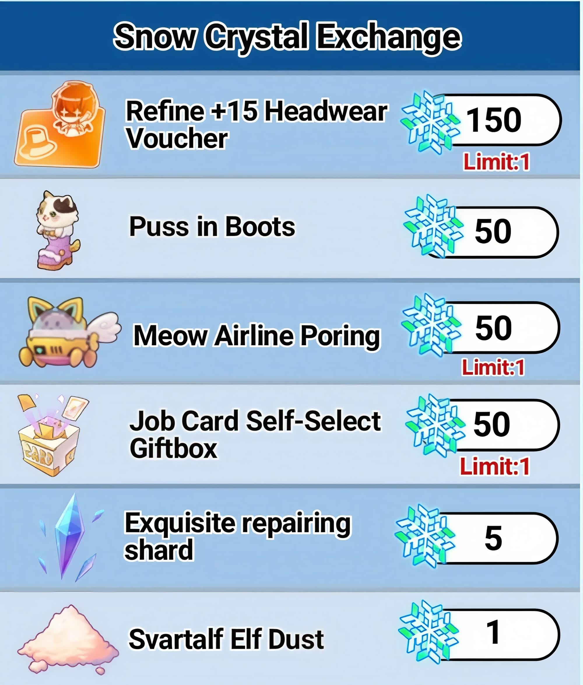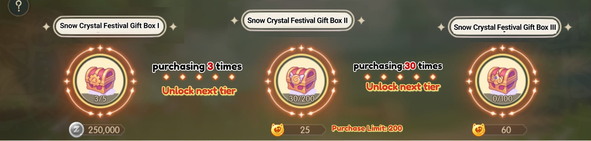 - Tier 1: “Snow Crystal Festival Gift Box I” Price: Zeny x250,000 (Purchase Limit: 5) Unlocks the next tier after 3 purchases.