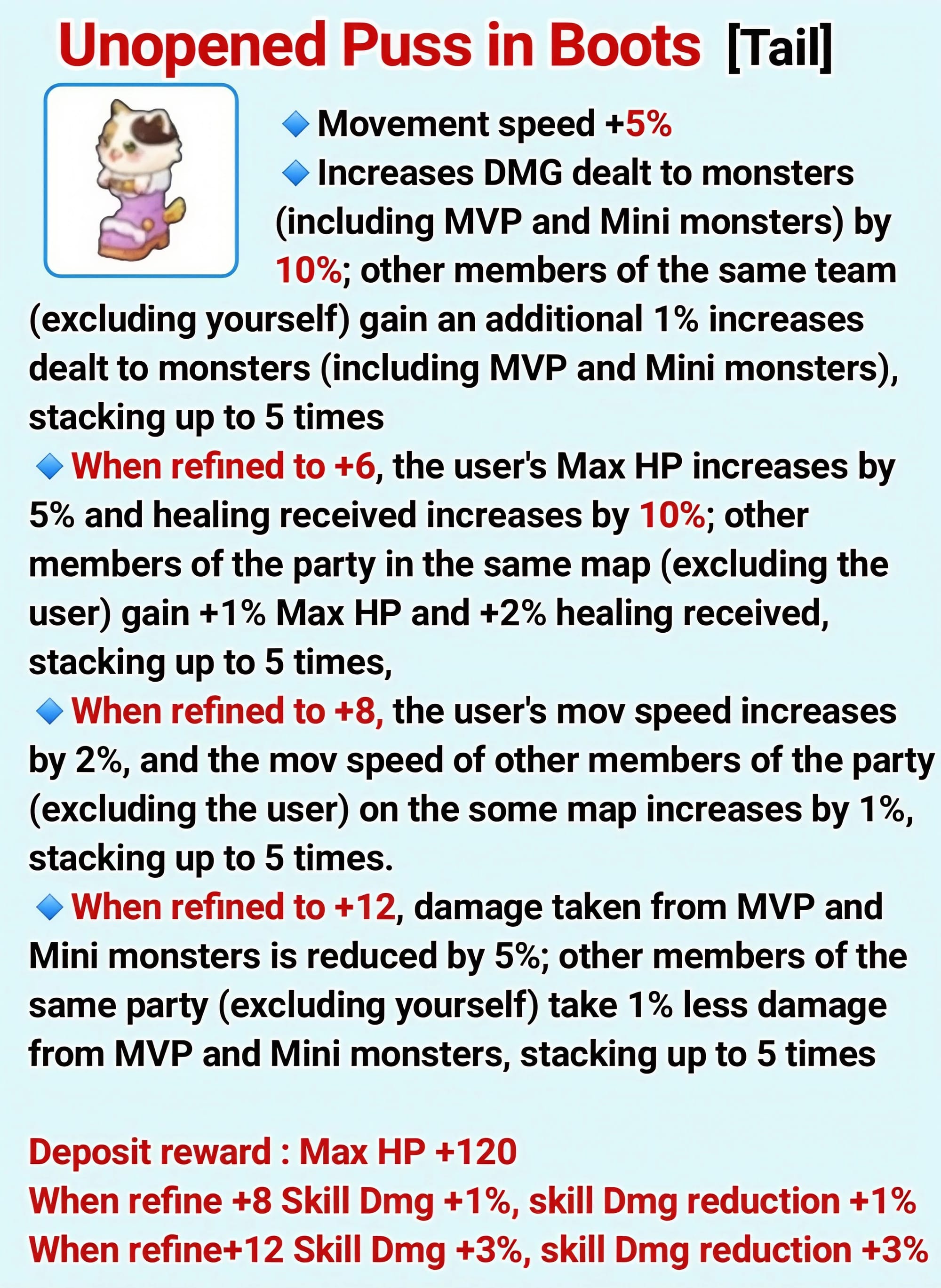 - เมื่อรีไฟน์ +12: ลดความเสียหายที่ได้รับจากมอนสเตอร์ MVP และ Mini -5% สมาชิกทีมคนอื่น (ไม่รวมผู้สวมใส่) จะได้รับลดความเสียหายจาก MVP และ Mini -1% สามารถซ้อนทับได้สูงสุด 5 ครั้ง