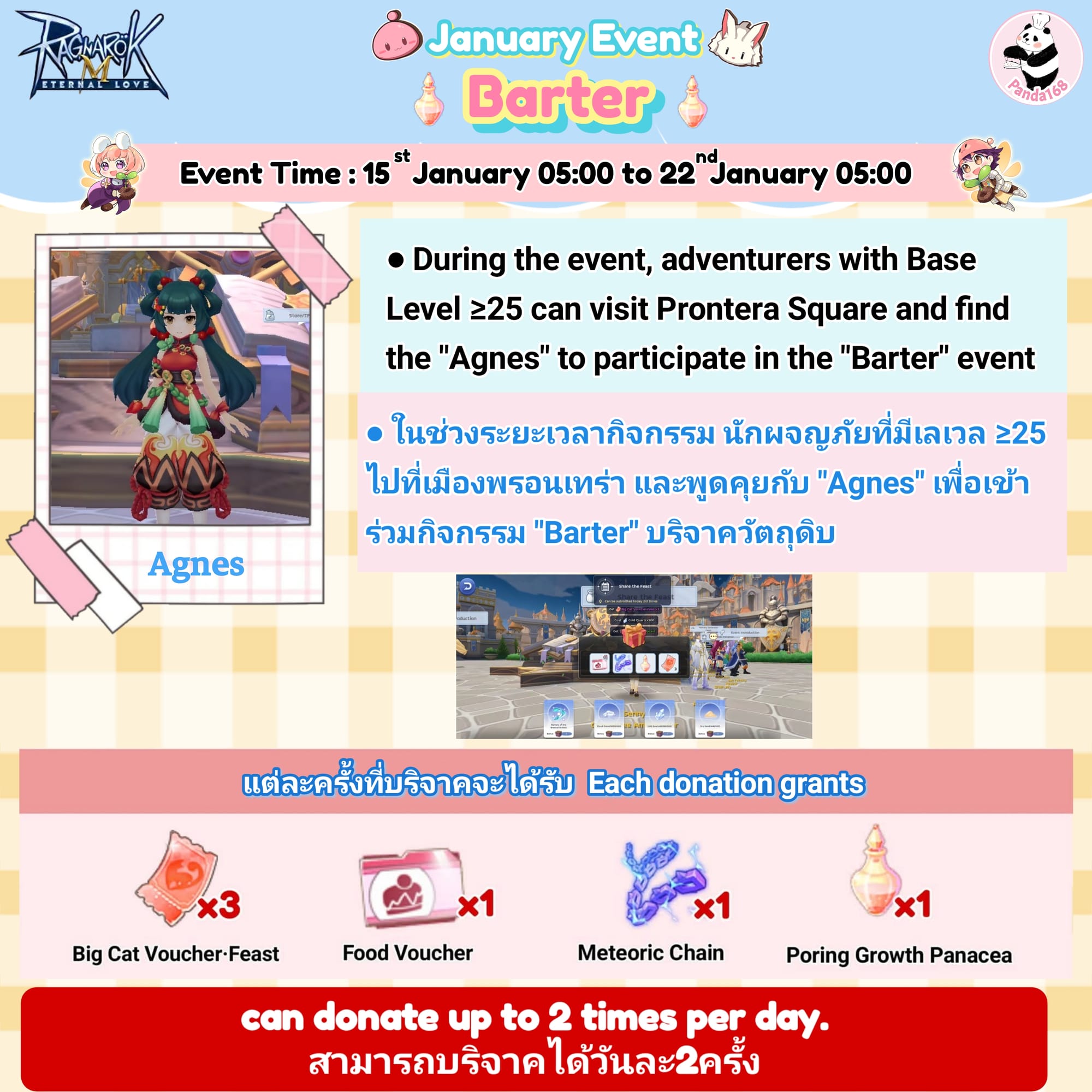 - ในระหว่างกิจกรรม นักผจญภัยที่มีเลเวลฐาน ≥ 25 สามารถไปที่จัตุรัส Prontera และค้นหา "Agnes" เพื่อเข้าร่วมกิจกรรม "Barter"