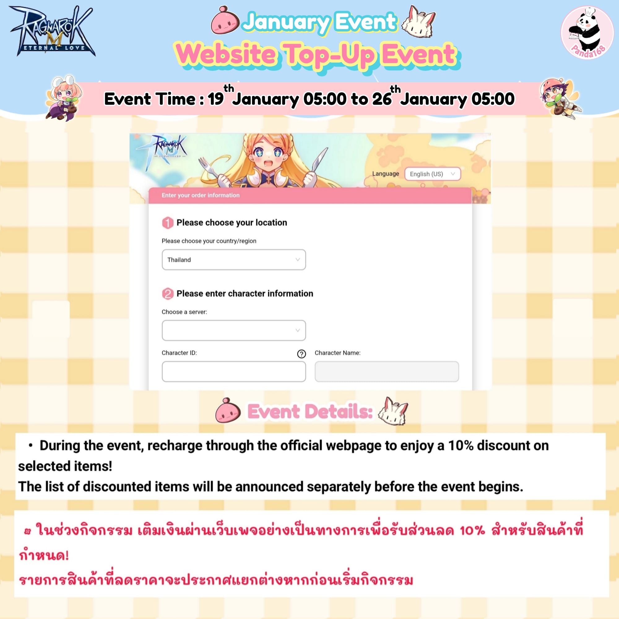 - ระหว่างกิจกรรม เติมเงินผ่านเว็บไซต์ทางการเพื่อรับส่วนลด 10% สำหรับสินค้าที่เลือก! รายการสินค้าลดราคาจะถูกประกาศแยกต่างหากก่อนที่กิจกรรมจะเริ่มขึ้น