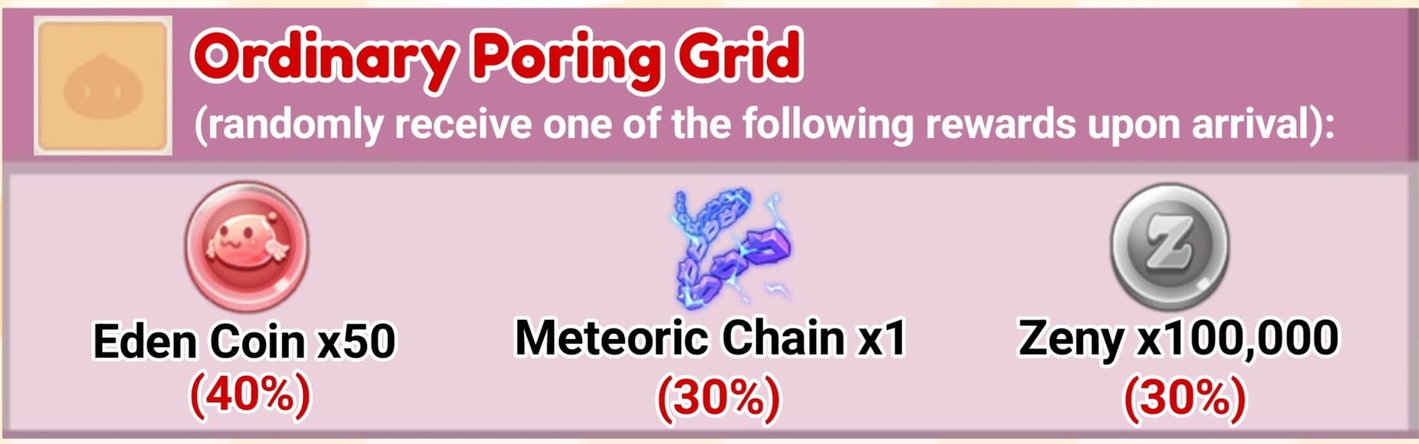 - Normal Poring Grid (ได้รับของรางวัลทุกๆครั้งที่ตกลงในช่อง): มีโอกาสที่จะได้รับ